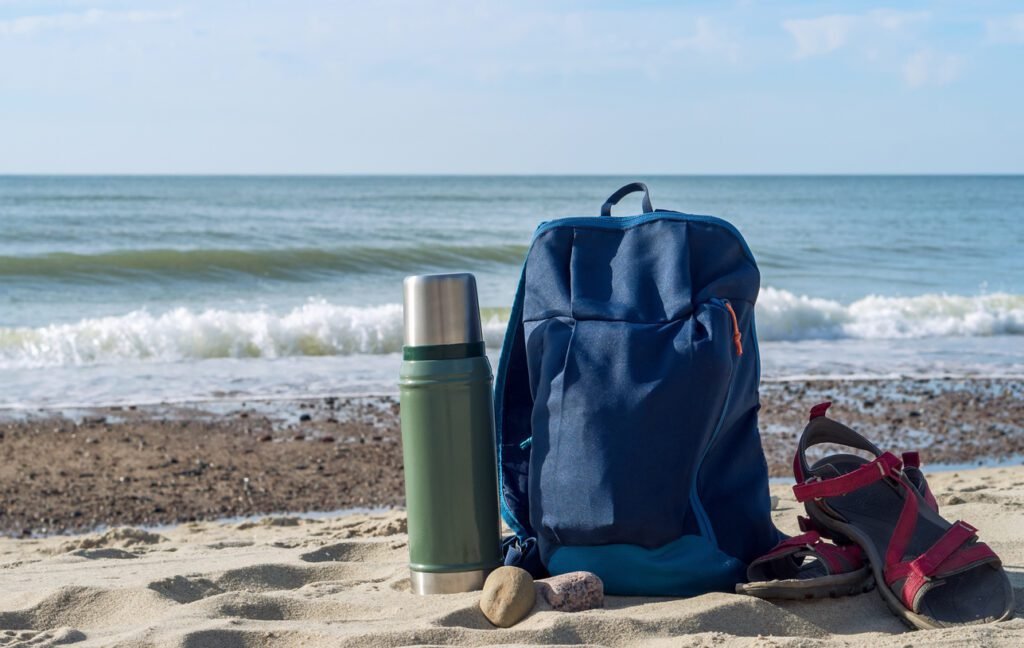 A thermos of tea and a backpack against the backdrop of nature. Drinking tea on the seashore. Walking along the seashore.